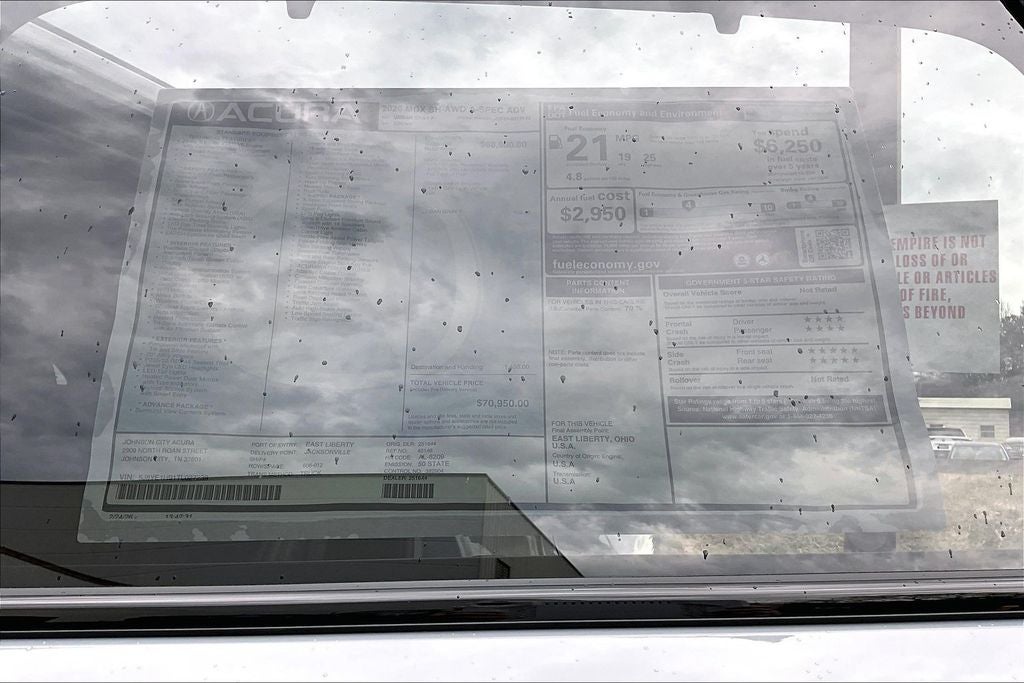 19 Speakers, 3rd row seats: split-bench, 4-Wheel Disc Brakes, ABS brakes, Air Conditioning, Alloy wheels, AM/FM radio, Anti-whiplash front head restraints, Apple CarPlay/Android Auto, Audio memory, Auto High-beam Headlights, Auto tilt-away steering wheel, Auto-dimming Rear-View mirror, Automatic temperature control, Brake assist, Bumpers: body-color, Compass, Curvilinear Quilted Perforated Premium Milano Leather Seats, Delay-off headlights, Driver door bin, Driver vanity mirror, Dual front impact airbags, Dual front side impact airbags, Electronic Stability Control, Emergency communication system: AcuraLink, Exterior Parking Camera Rear, Four wheel independent suspension, Front anti-roll bar, Front Bucket Seats, Front Center Armrest, Front dual zone A/C, Front fog lights, Front reading lights, Fully automatic headlights, Garage door transmitter: HomeLink, Heads-Up Display, Heated and Ventilated Front Sport Seats, Heated door mirrors, Heated front seats, Heated rear seats, Heated steering wheel, HVAC memory, Illuminated entry, Knee airbag, Lane departure: Lane Keeping Assist System (LKAS) active, Leather steering wheel, Low tire pressure warning, Memory seat, Navigation system: Google built-in (3-Years Unlimited Data Plan for In-Vehicle Apps), Occupant sensing airbag, Outside temperature display, Overhead airbag, Overhead console, Panic alarm, Passenger door bin, Passenger vanity mirror, Power door mirrors, Power driver seat, Power Liftgate, Power moonroof, Power passenger seat, Power steering, Power windows, Premium audio system: Acura/ELS Studio 3D, Radio data system, Radio: Bang & Olufsen Premium Audio System, Rain sensing wipers, Rear air conditioning, Rear anti-roll bar, Rear reading lights, Rear seat center armrest, Rear window defroster, Rear window wiper, Remote keyless entry, Security system, Speed control, Speed-sensing steering, Speed-Sensitive Wipers, Split folding rear seat, Spoiler, Sport steering wheel, Steering wheel memory, Steering wheel mounted audio controls, Tachometer, Telescoping steering wheel, Tilt steering wheel, Traction control, Trip computer, Turn signal indicator mirrors, Variably intermittent wipers, Ventilated front seats, and Wheels: 20 x 9J Aluminum Alloy.