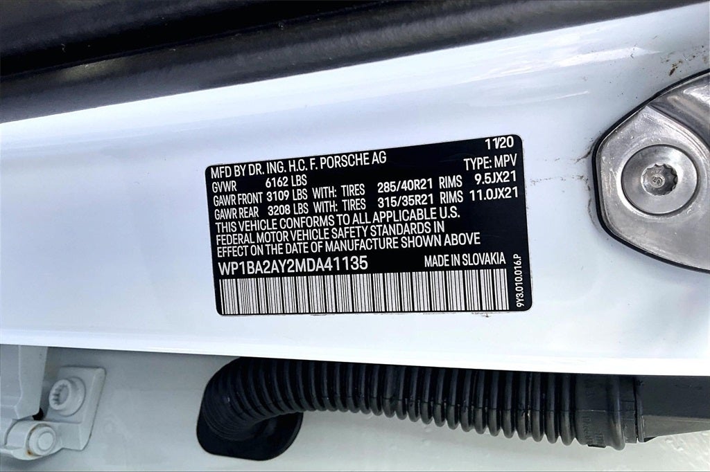 10 Speakers, 8-Way Power Sport Seats, Adaptive suspension, AM/FM radio: SiriusXM, Delay-off headlights, Exterior Parking Camera Rear, Front Bucket Seats, Garage door transmitter: HomeLink, Illuminated entry, Leather Seat Trim, Leather Shift Knob, Navigation System, Outside temperature display, Porsche Communication Management, Power door mirrors, Power driver seat, Power Liftgate, Power passenger seat, Rear fog lights, Spoiler, Steering wheel mounted audio controls, Telescoping steering wheel, Tilt steering wheel, 4-Wheel Disc Brakes, ABS brakes, Air Conditioning, Alloy wheels, Apple CarPlay, Automatic temperature control, Axle Ratio: TBD, Brake assist, Bumpers: body-color, Driver door bin, Driver vanity mirror, Dual front impact airbags, Dual front side impact airbags, Electronic Stability Control, Four wheel independent suspension, Front anti-roll bar, Front Center Armrest, Front dual zone A/C, Front reading lights, Fully automatic headlights, Heated door mirrors, Knee airbag, Low tire pressure warning, Occupant sensing airbag, Overhead airbag, Overhead console, Panic alarm, Passenger door bin, Passenger vanity mirror, Power steering, Power windows, Radio data system, Rain sensing wipers, Rear anti-roll bar, Rear reading lights, Rear seat center armrest, Rear side impact airbag, Rear window defroster, Remote keyless entry, Security system, Speed control, Split folding rear seat, Tachometer, Traction control, Trip computer, Turn signal indicator mirrors, Variably intermittent wipers, Voltmeter, and Wheels: 20 Cayenne Design.