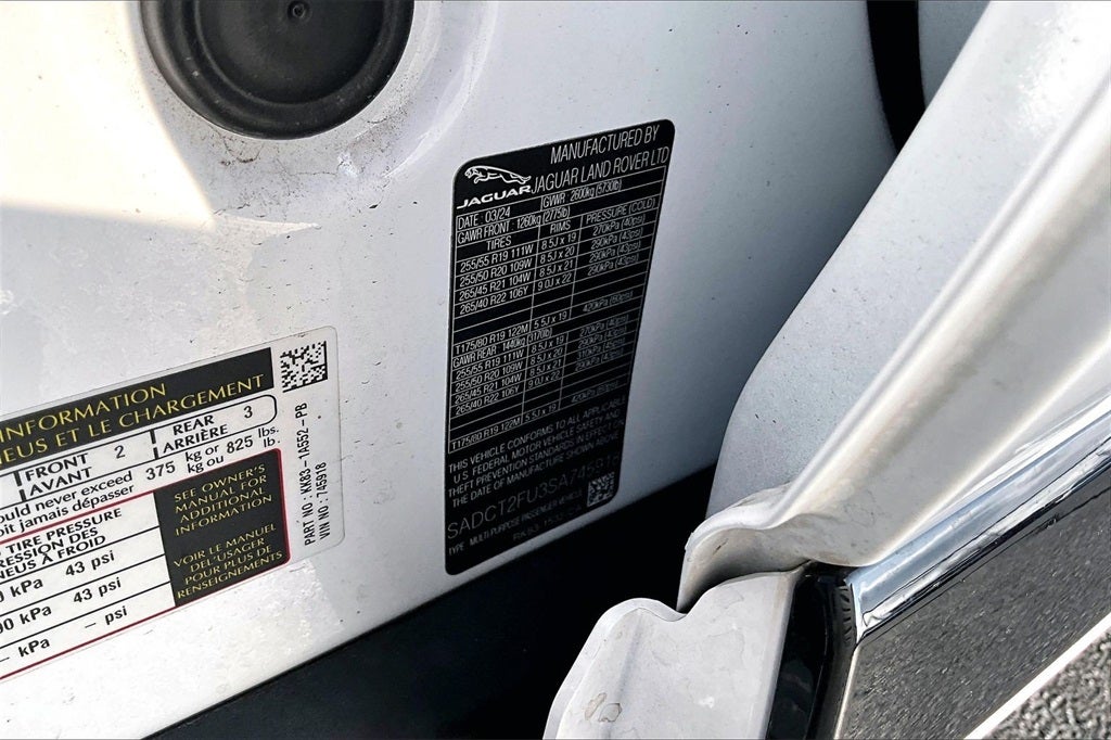 2025 Jaguar F-PACE P400 R-Dynamic S White Apple CarPlay/Android Auto, Exterior Parking Camera Rear, Fully automatic headlights, Illuminated entry, Power Liftgate, Power moonroof, Radio: Meridian 400W Sound System, Telescoping steering wheel, Tilt steering wheel, Wheels: 19 Diamond Turned (Style 5103). 4D Sport Utility AWD 3.0L I6 Turbocharged 8-Speed Automatic